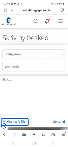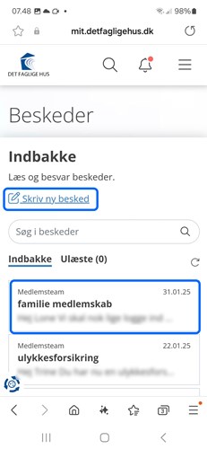 Gå til MIT detfagligehus. – husk at du skal logge ind med MitID. Hvis dokumenterne skal sendes i en eksisterende tråd, så vælg tråden. Ellers så vælg ”Skriv ny besked”.