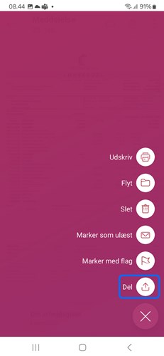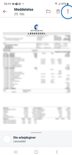 Åben e-Boks appen og log ind. Find beskeden med dokumenterne og tryk på de 3 prikker i øverste højre hjørne.