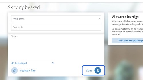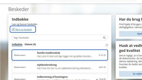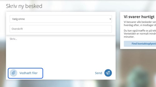(Go to MIT detfagligehus and log in with MitID. If the documents are to be sent in an existing thread, select the thread at the bottom. Otherwise select "Skriv ny besked".)