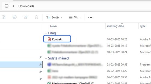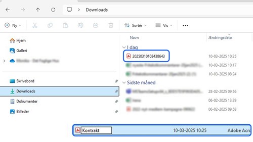 Find pdf’en der hvor du har gemt den. Navngiv filen med et retvisende navn som fx ”Kontrakt” eller ”Opsigelse” ved at trykke på ”F2”, skriv navnet og tryk på ”Enter”.